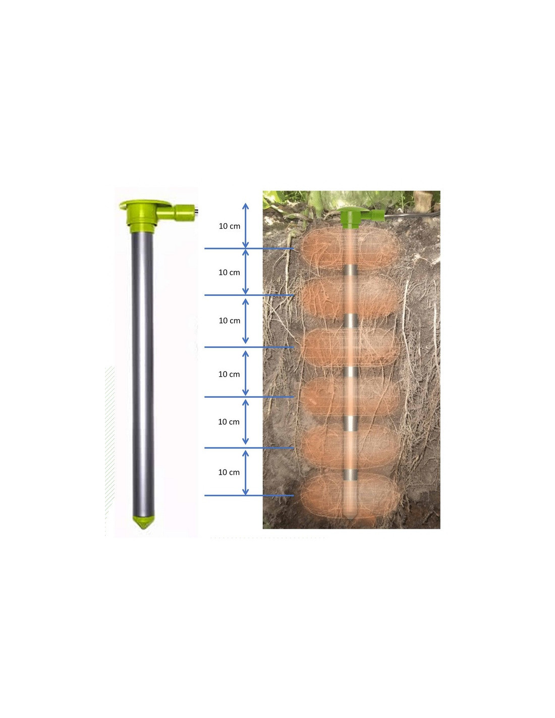 The soil temperature and humidity probe is designed for permanent installations and has 2 to 15 sensors distributed along the probe body. It includes a 6 meter long cable.