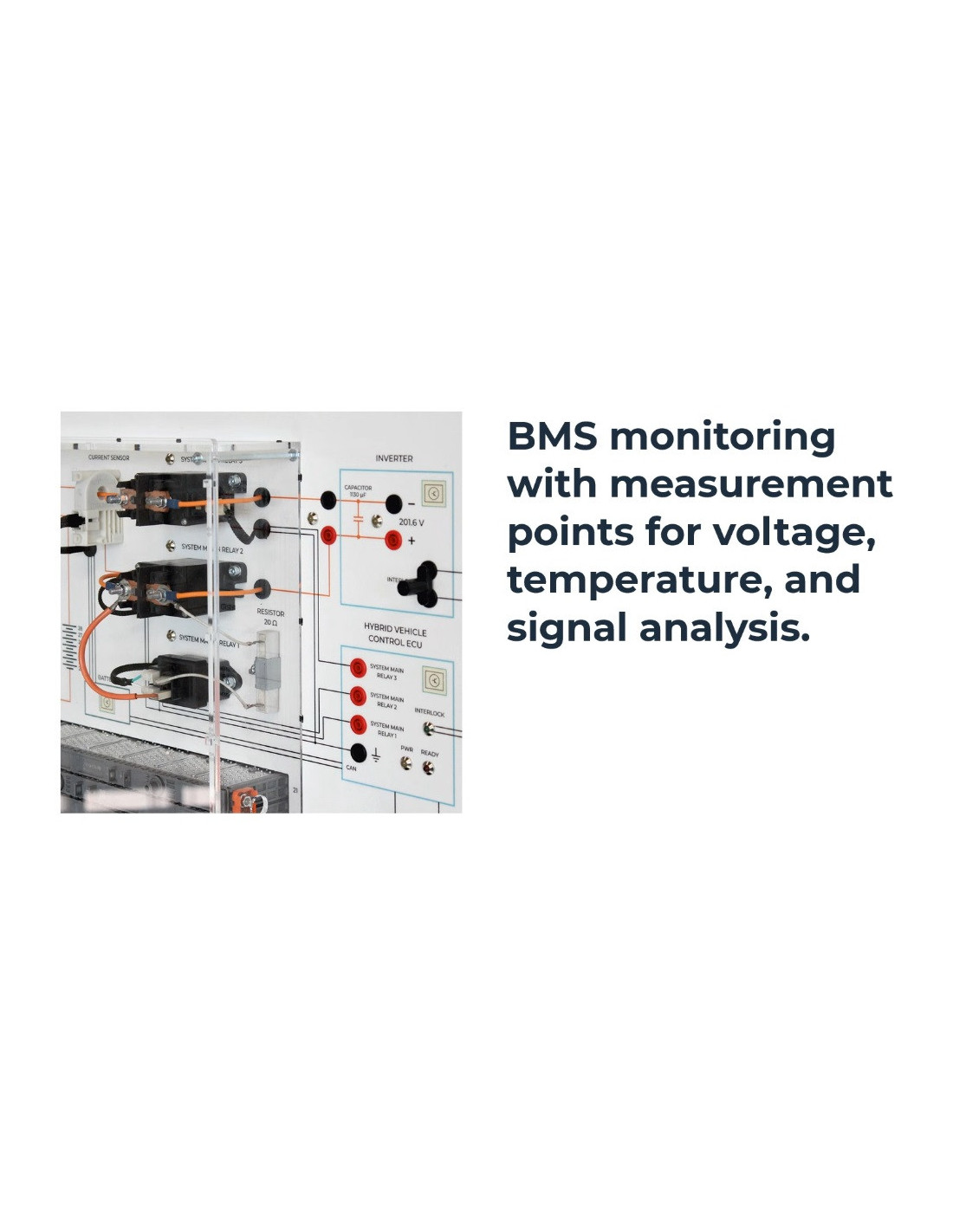 It enables students to connect and disconnect service plugs, measure battery voltage, and understand power transfer from the battery to the inverter. Equipped with a detailed wiring diagram and the ability to measure each battery cell separately, this trainer replicates real-world electric car conditions.