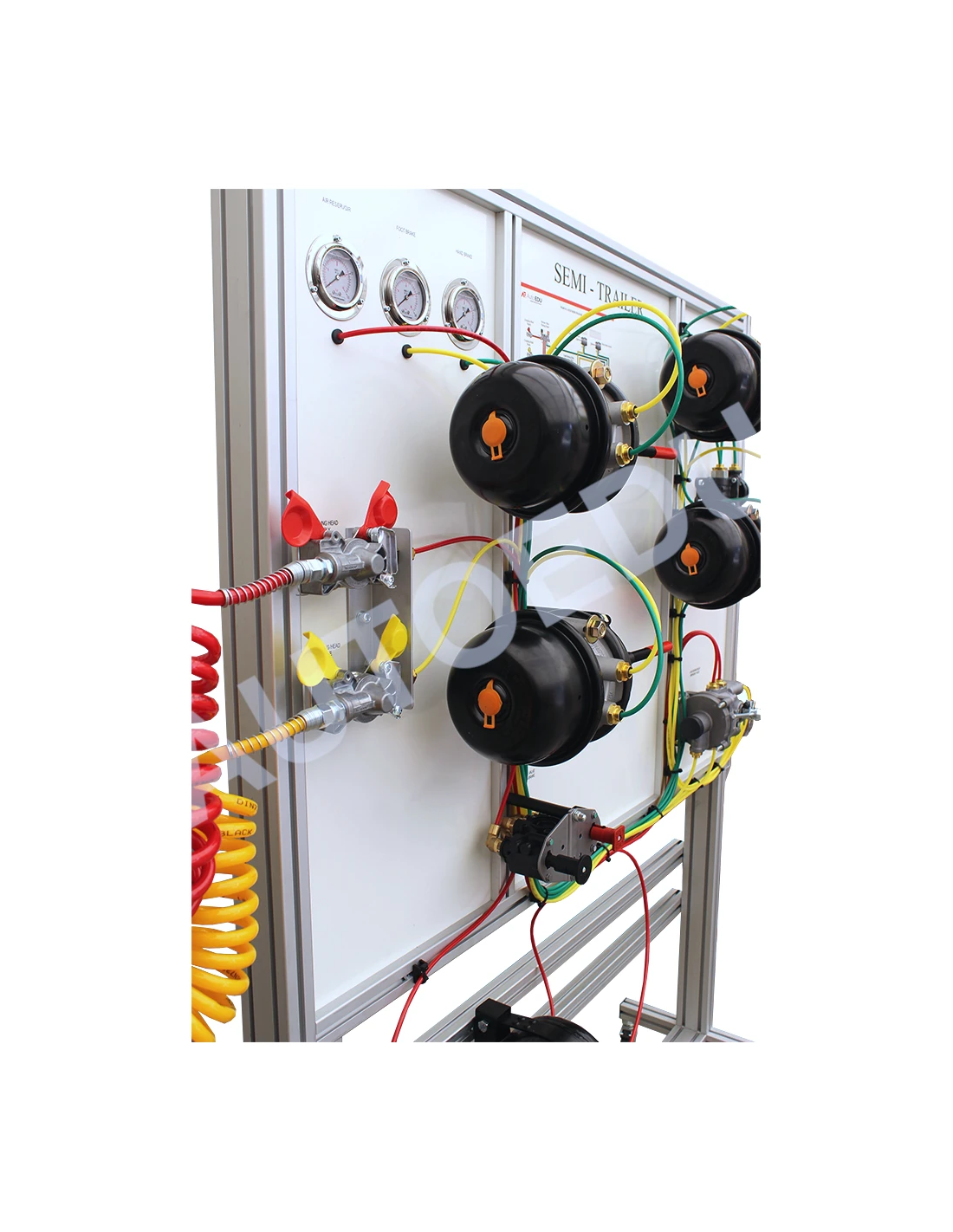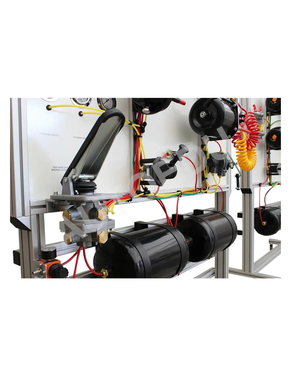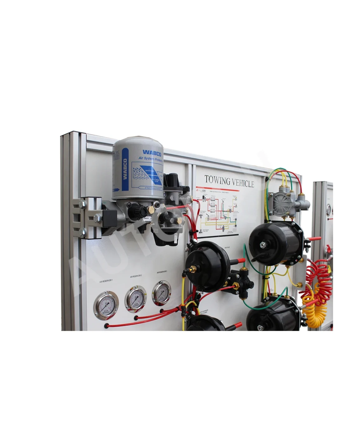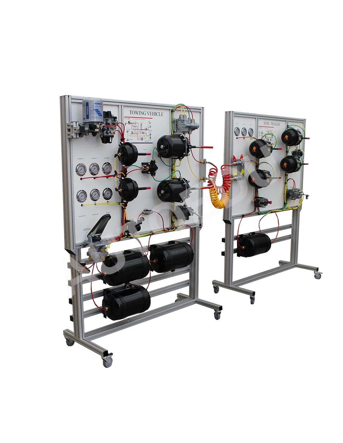 Demonstration stand for learning the construction and operation of air brake systems with ABS for trucks and semi-trailers.