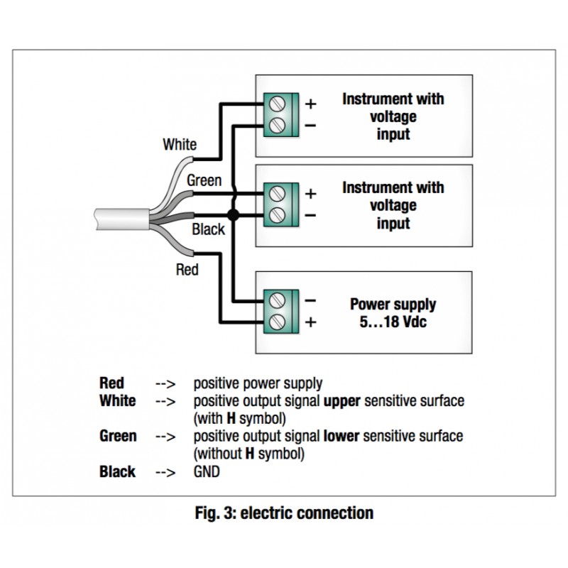 Conecte el cable a un instrumento o registrador de datos con entrada de voltaje analógico y encienda el sensor de acuerdo con la codificación de colores que se muestra en la figura 3.