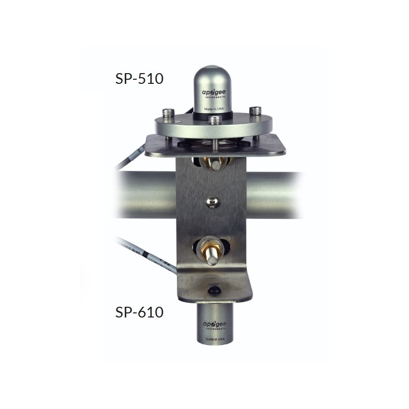 El sensor también puede acoplarse a nuestro piranómetro orientado hacia abajo para formar un albedómetro. Para esta aplicación, recomendamos el paquete de sensor de albedómetro Apogee SP-710-SS, que consta de un piranómetro orientado hacia arriba SP-510-SS, un piranómetro orientado hacia abajo SP-610-SS, un divisor diferencial AY-001 y un cable AW-605-SS de 5 metros.