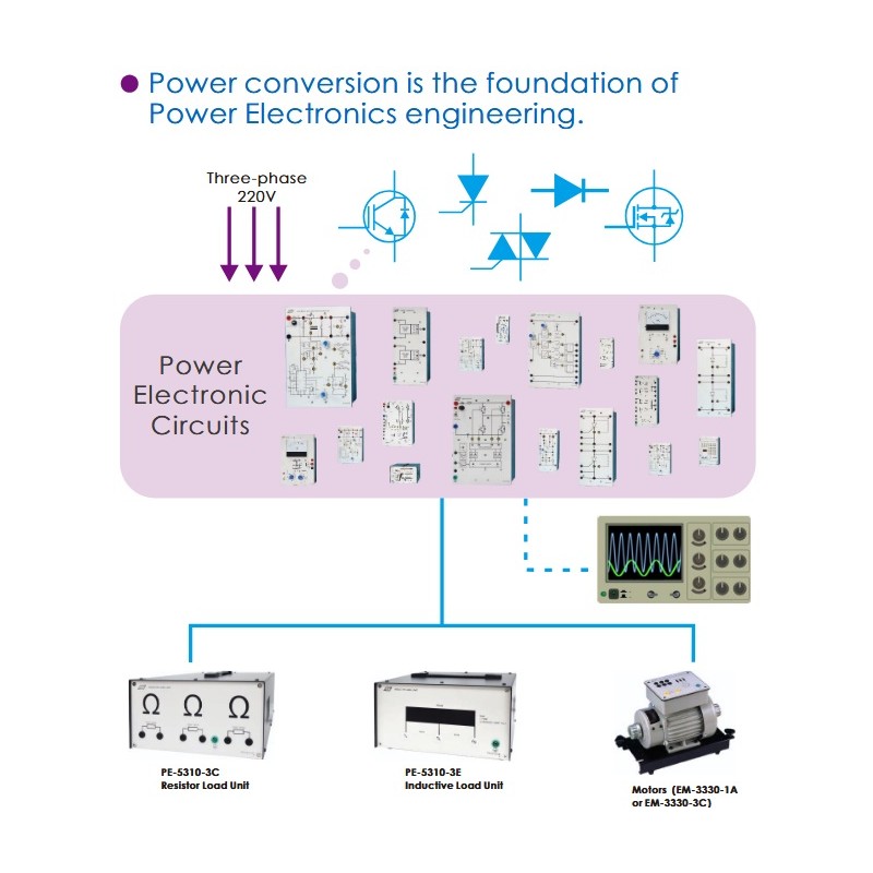 PE-5000 es una combinación de enegía, electrónica y control. Contiene amplia aplicación de electrónica de estado sólido para el control y la conversión de potencia eléctrica. Los circuitos de potencia electrónica contienen rectificadores, choppers e inversores. Para la experimentación de los módulos PE-5000 incluyen convertidor, fuente de alimentación, carga, control y módulos de prueba. Los módulos de experimentación e instrumentos son introducidos y demostrados en las experimentaciones posteriores.