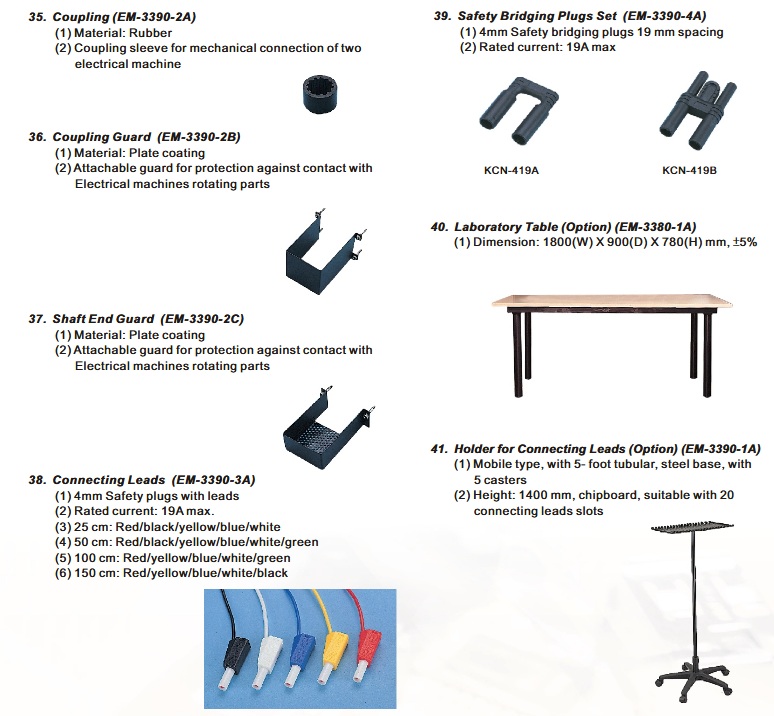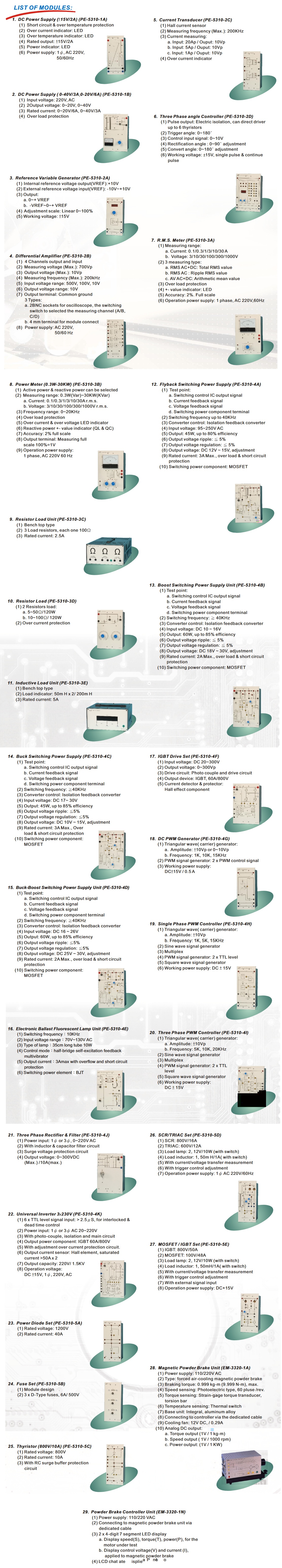 El sistema PE-5000 consiste en 28 módulos experimentales, contiene motor de jaula de ardilla trifásica, carga, control y dispositivo de medición. PE-5000 incluye rectificador monofásico, rectificador trifásico, DC choppers, inversor y aplicaciones de experimentos.
