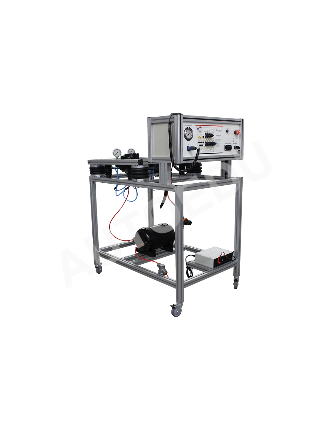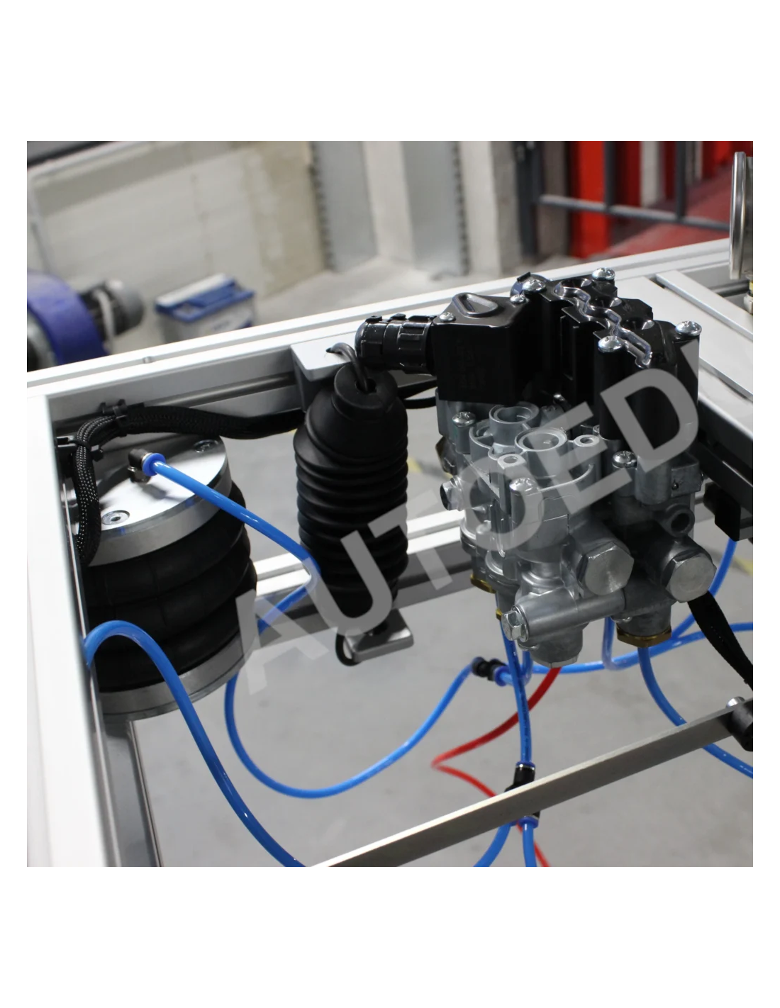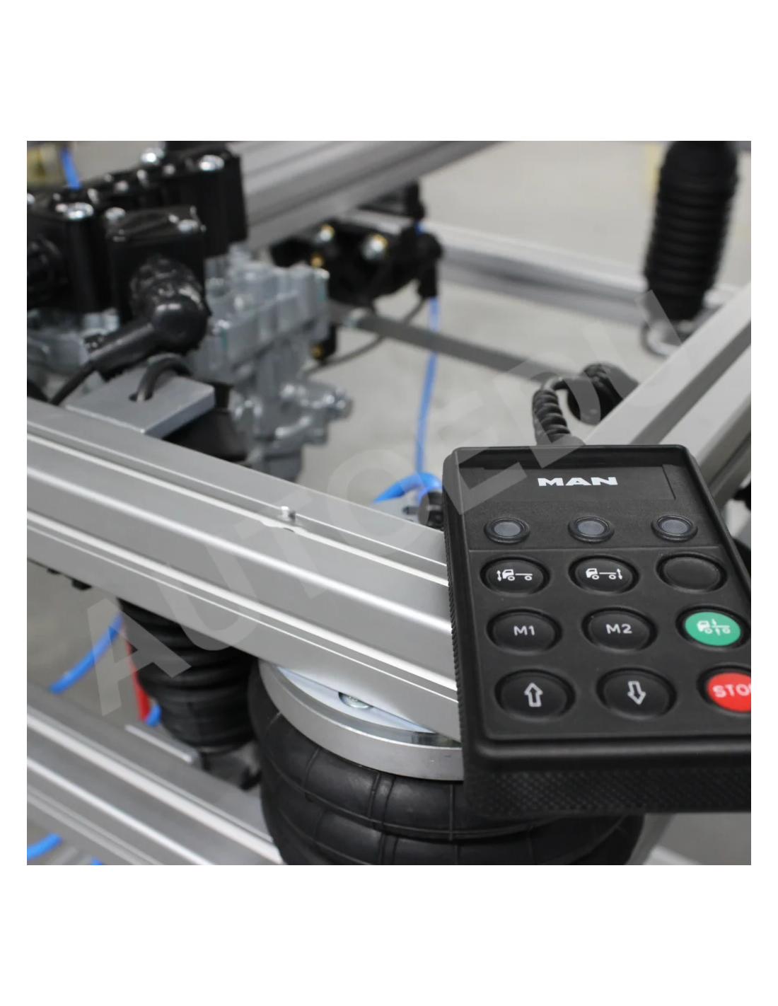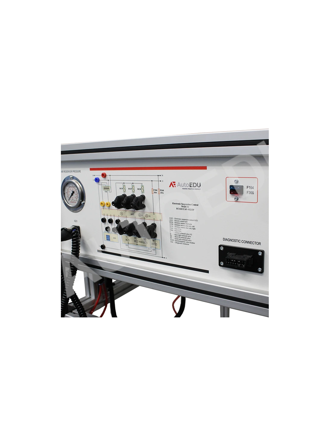 Este simulador educativo de suspensión neumática para camiones, totalmente operativo, incluye un sistema completo de suspensión neumática controlada electrónicamente (ECAS), un depósito de aire, una unidad de control electrónico (ECU) de la ECAS, sensores de altura para los ejes delantero y trasero, y un panel de control remoto para ajustes de altura y diagnósticos.
