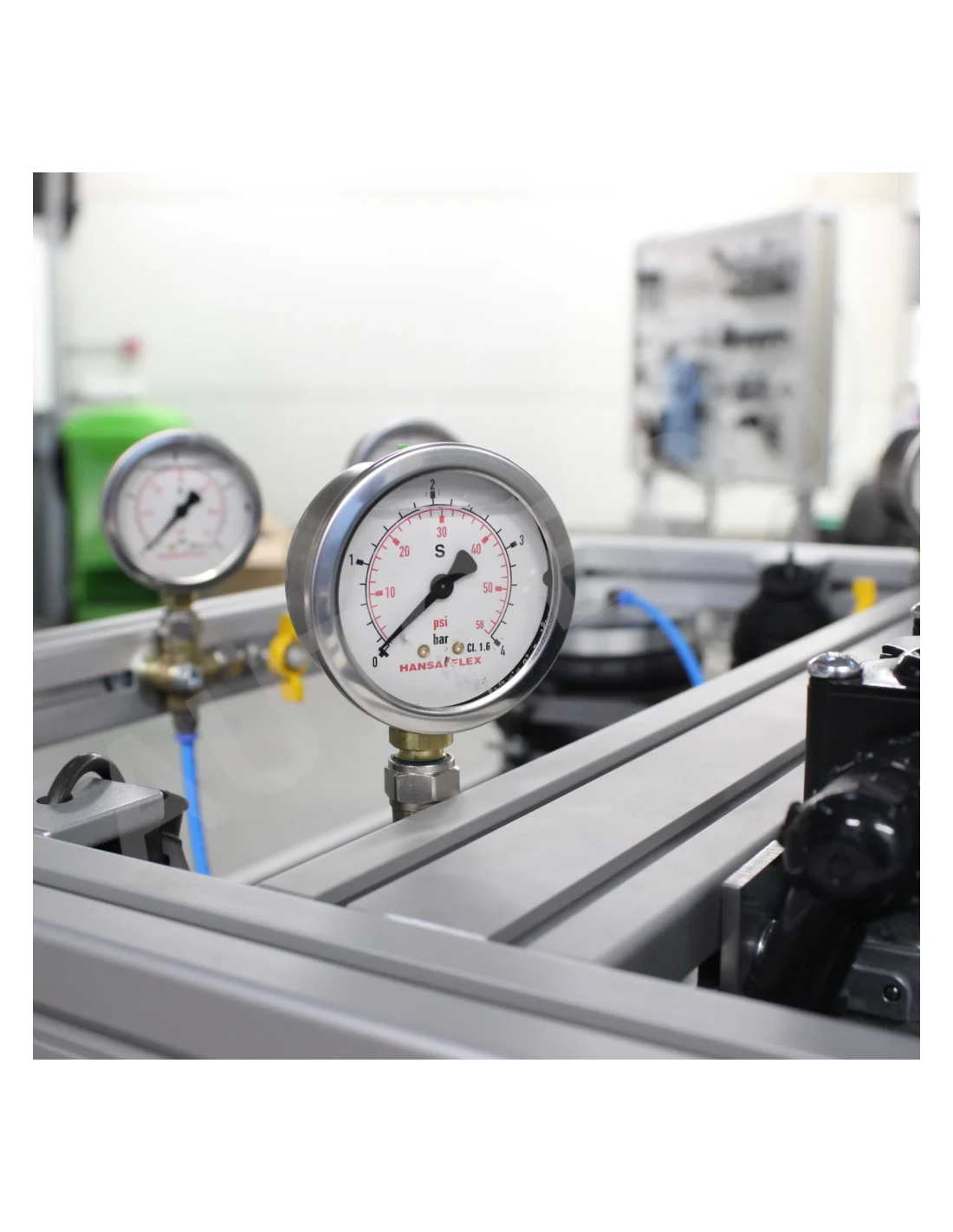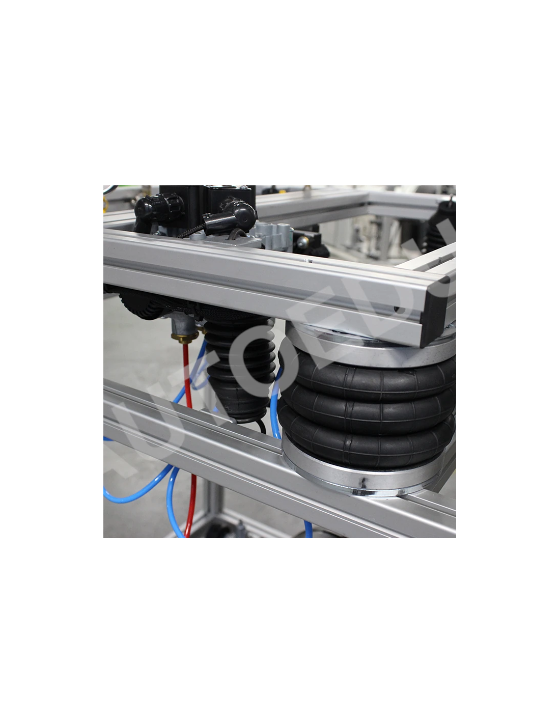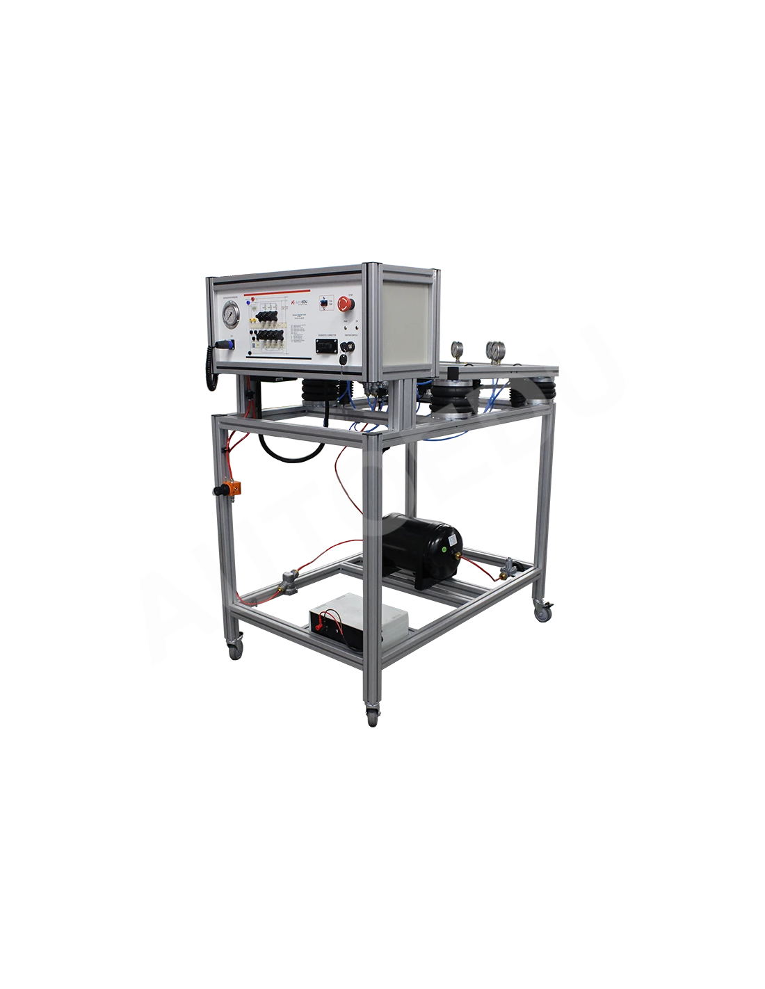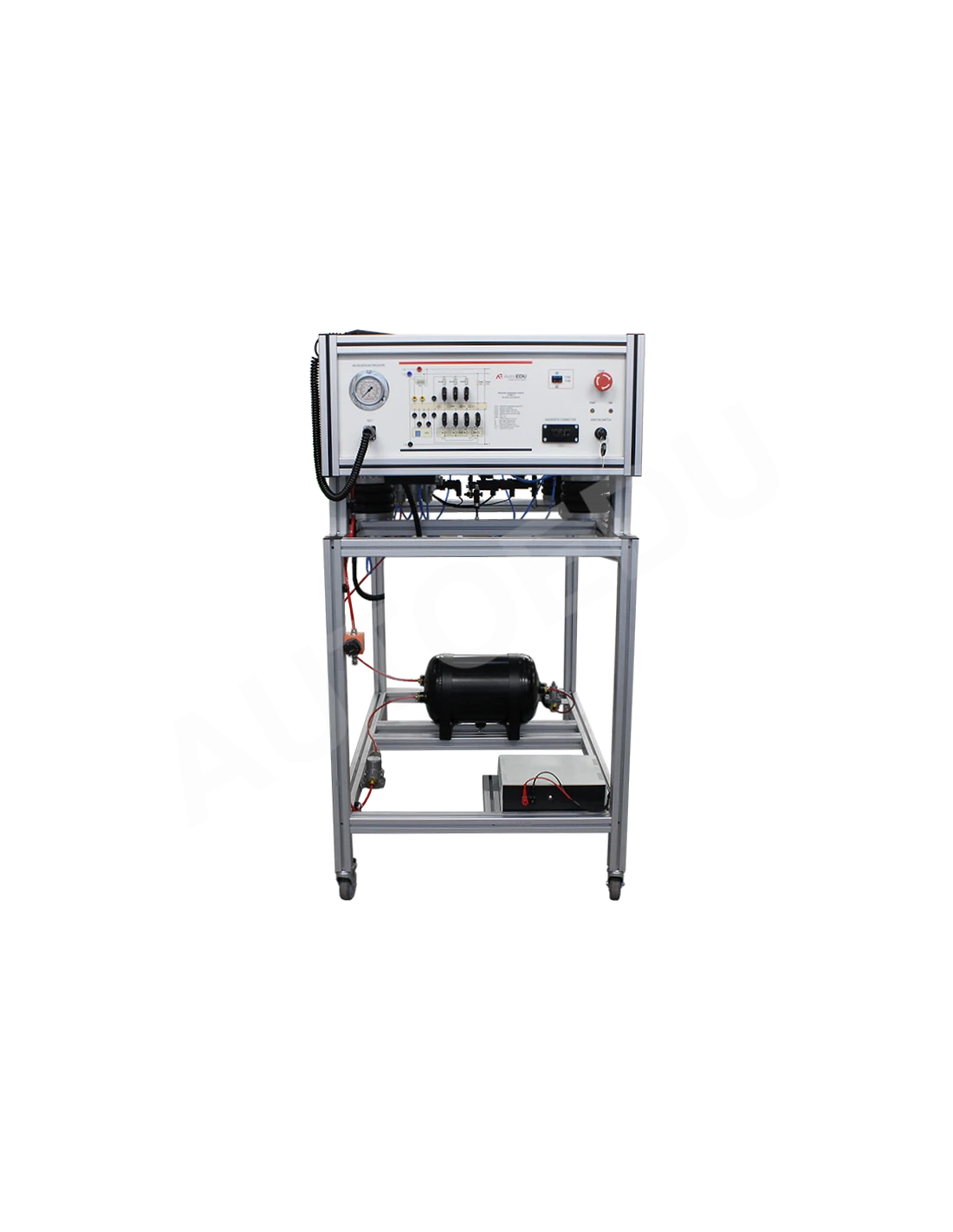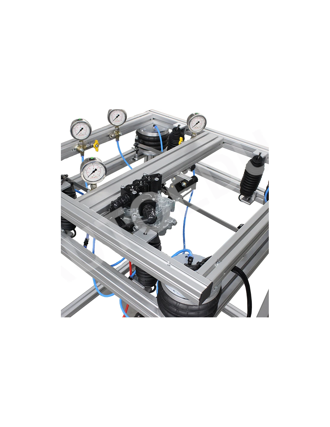 Este simulador educativo de suspensión neumática para camiones, totalmente operativo, incluye un sistema completo de suspensión neumática controlada electrónicamente (ECAS), un depósito de aire, una unidad de control electrónico (ECU) de la ECAS, sensores de altura para los ejes delantero y trasero, y un panel de control remoto para ajustes de altura y diagnósticos.