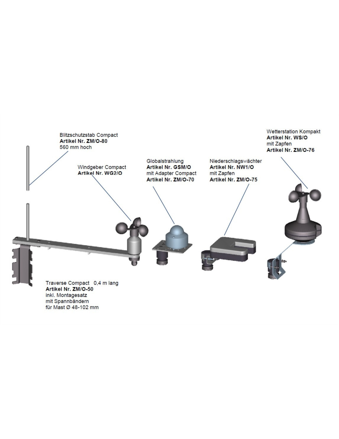 Mastro telescópico: para instalação em campo de instrumentos de medição meteorológica. Mastro com permanência, placa base e adaptador. A placa de base tem um receptáculo de mastro inclinado. Crosspiece para transmissores de vento clássicos: para montar o transmissor de velocidade do vento e o transmissor de direção do vento juntos em um mastro. A travessia é conectada ao plugue de acordo com as combinações do transmissor.