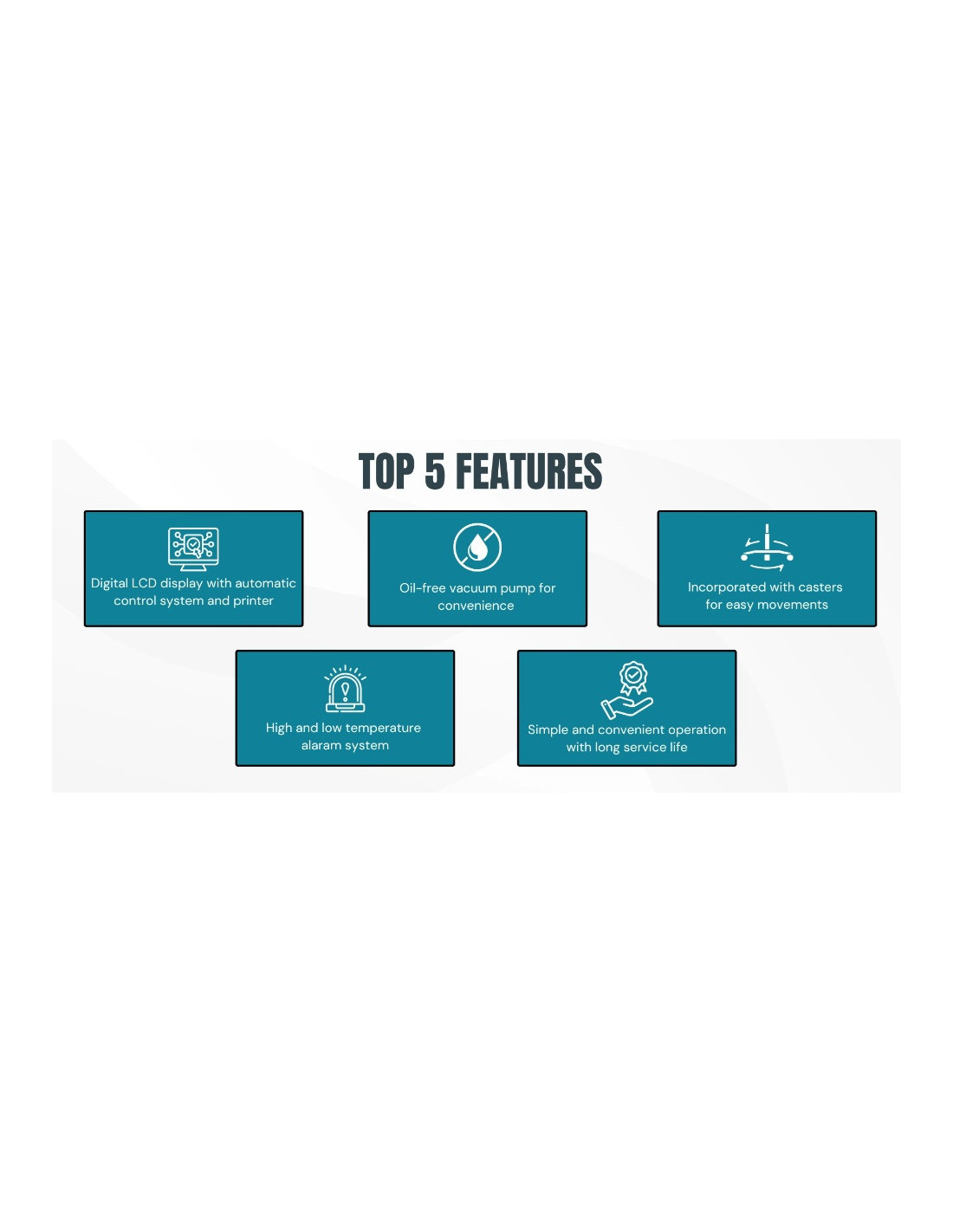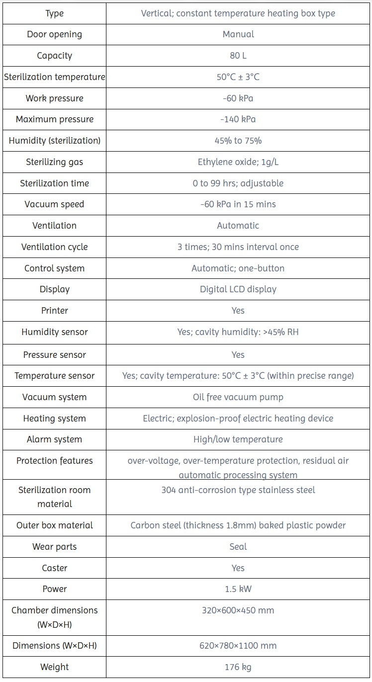 Com abertura manual da porta, oferece uma capacidade de 80 L, uma temperatura de esterilização de 50 °C e uma pressão de trabalho de -60 kPa.