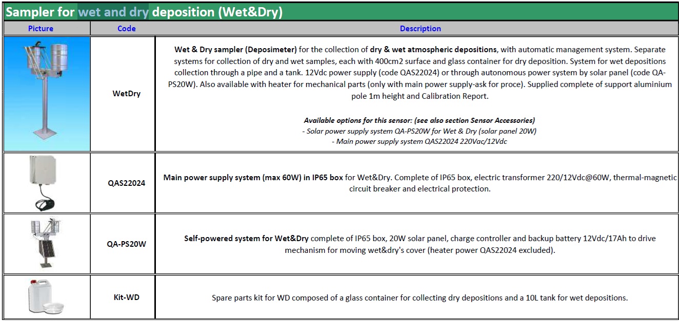 O amostrador Wet & Dry é um instrumento para a coleta de deposição atmosférica seca (poeira, etc.) e úmida (chuva, neve), construída em conformidade com a Legislação Européia 96/62 / EC, transposta pelo Decreto Italiano 351 de 08/04 / 99